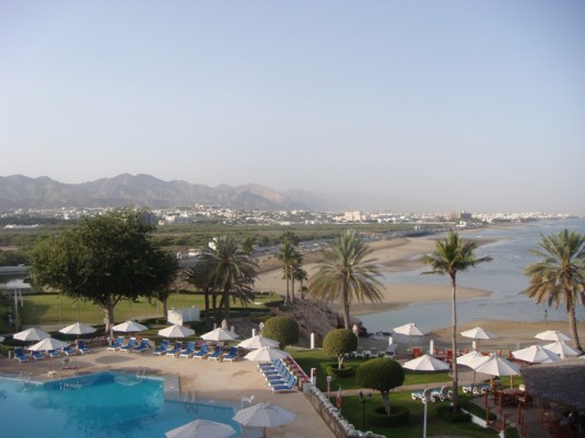 John and I also stayed at the Crowne Plaza in Muscat and loved that view. It was New Year’s eve and we got into an amazing conversation with a group of Omani men celebrating the new year (without their wives, of course) in great style. I swam at the beach visible in the photo and was nearly knocked over by a fishing dhow that suddenly appeared from the creek behind the beach when the tide came in.