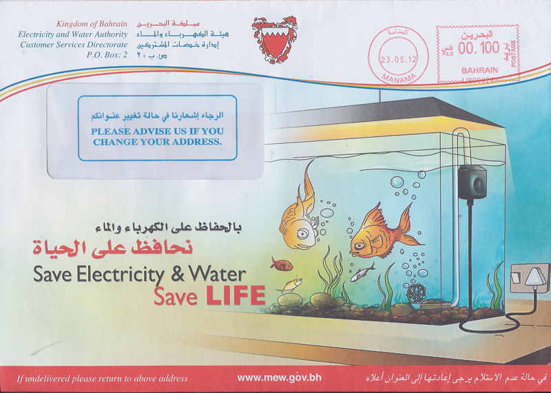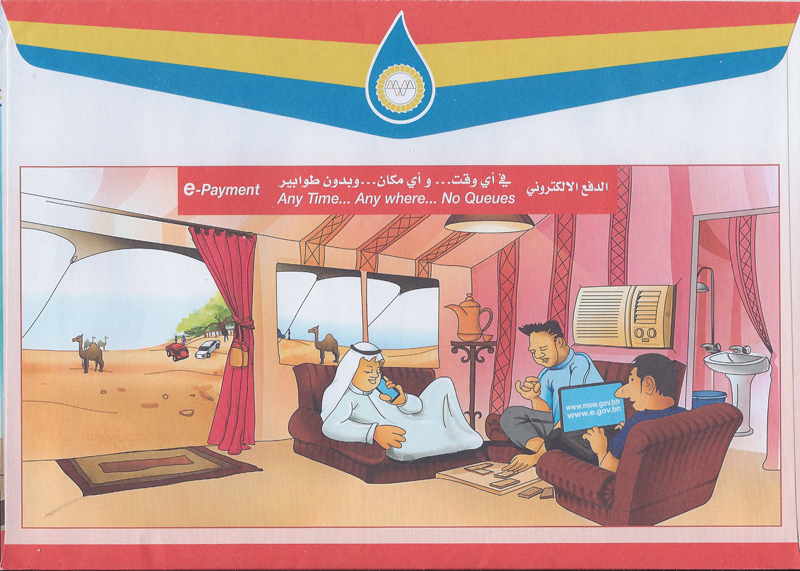 On the envelope’s opposite side is a wonderful drawing of modern Bahrainis getting back to nature during camping season. While enjoying life in the countryside, and without leaving their tents, they can pay their electricity bill from their mobile phone or laptop.