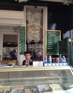 As our five children shouted their double-scoop orders, the young man suggested sitting down at a table where the waiter would serve us.  After three hours of walking, it sounded like a good idea.  The nine of us began crowding around tables and pulling up chairs.  Upon reading the menu we realized of course ice cream served “inside” was not 3.95 euros but 9 euros each.