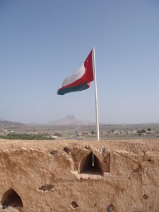 The interiors were similar but the views were great. Eventually we made our way to the highest rooftop that overlooked the valley. A French TV camera was taking pictures of the Omani flag waving in the wind.